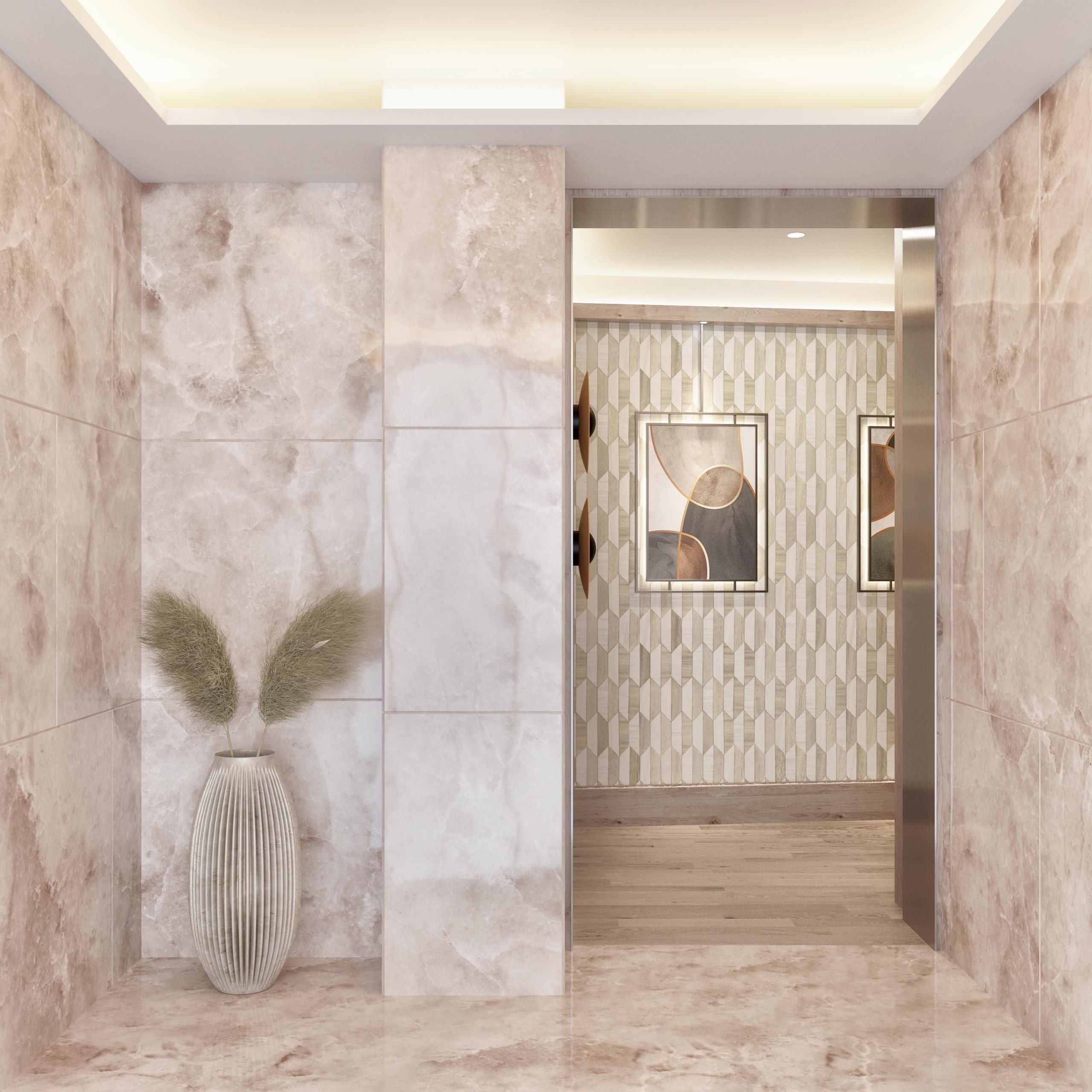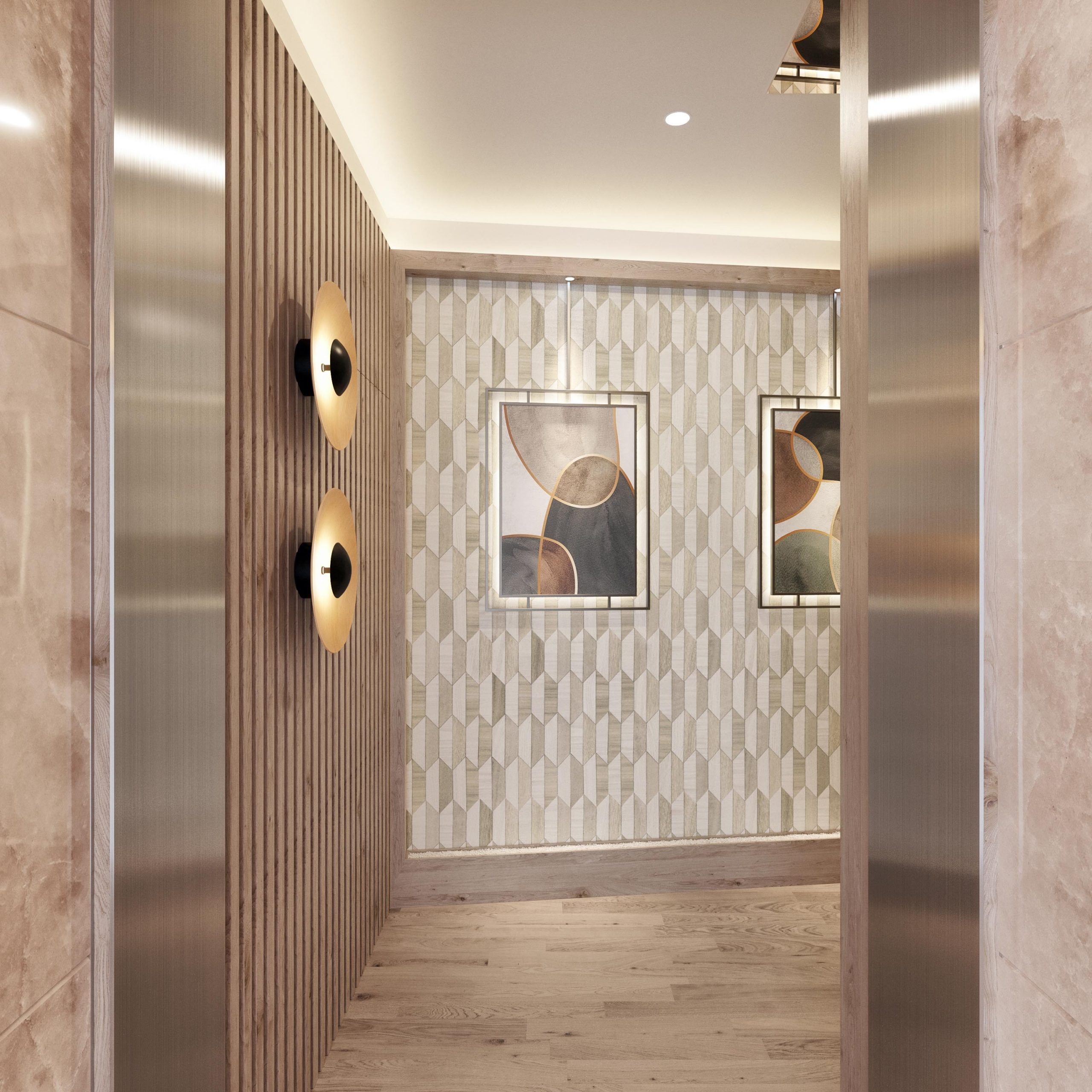 The elevator area is currently very dark, so we have designed some LED side sconces and a top in the same VESCOM fabric finish as the main decorative painting wall.